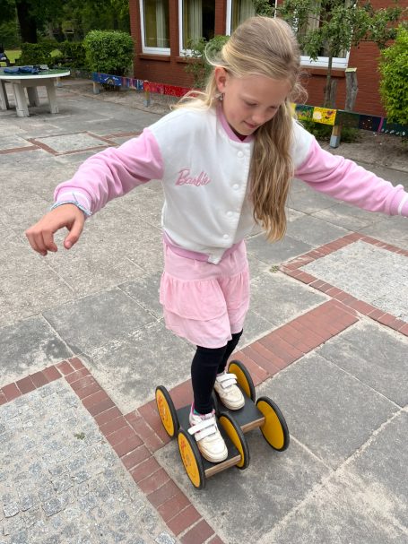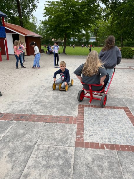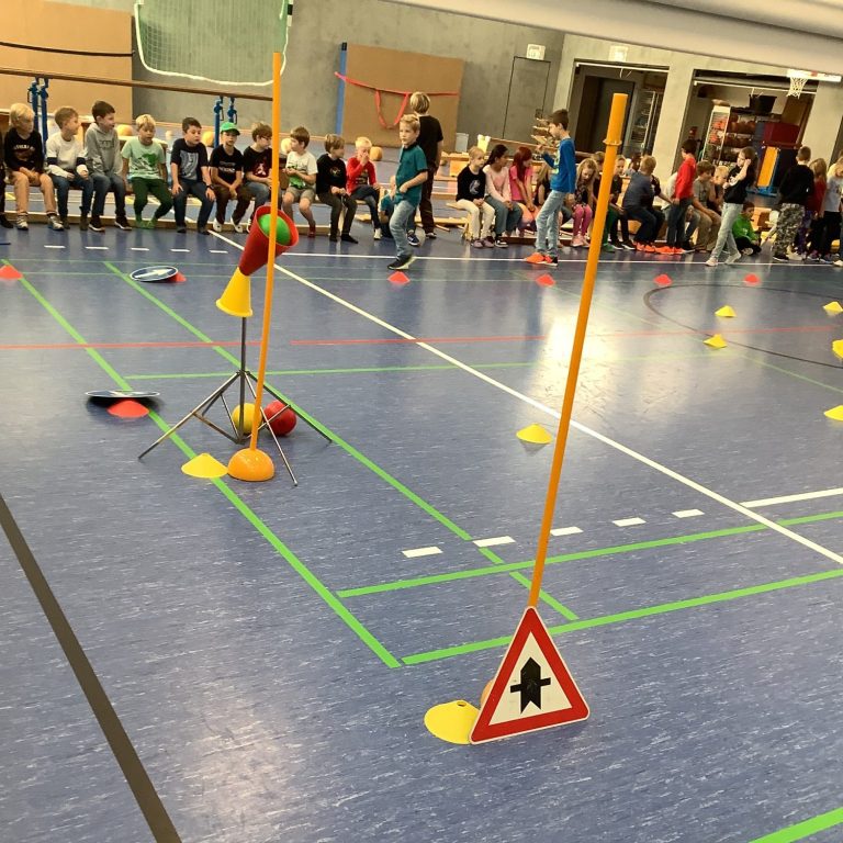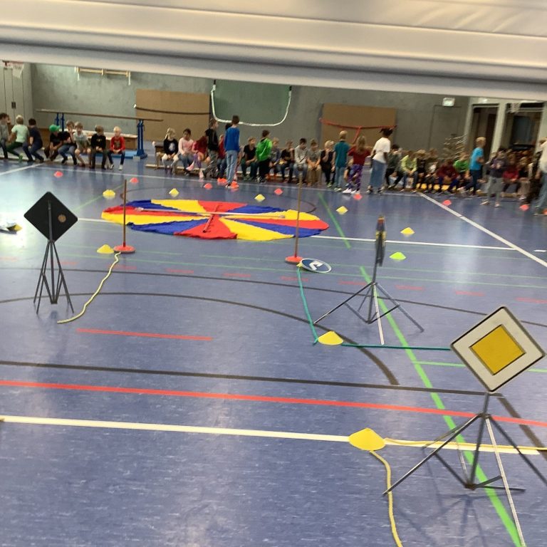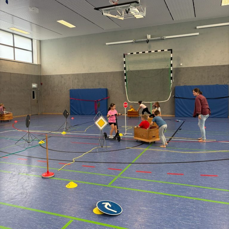 Auf dem Schulhof konnten die Kinder ihre Fähigkeiten beim Fahren mit dem Fahrrad oder Roller auf einem verkehrsnah gestalteten Übungsparcours unter Beweis stellen. Ergänzt wurden die Einheiten durch kurze Bewegungstrainings zur Förderung von Koordination und Reaktion – teils draußen, teils in der Turnhalle.