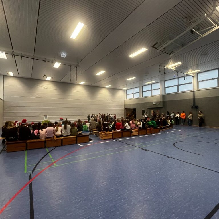 Am 20. Dezember feierten wir in der Sporthalle unsere Schul-Weihnachtsfeier mit allen Klassen und Lehrkräften. Unsere Schülerinnen und Schüler sorgten gemeinsam mit den Lehrkräften für ein abwechslungsreiches Programm. Es gab unter anderem ein wunderschönes Geigenstück, stimmungsvolle Weihnachtslieder, eine Aufführung der Theatergruppe und viele weitere kreative Beiträge.
