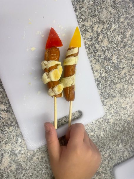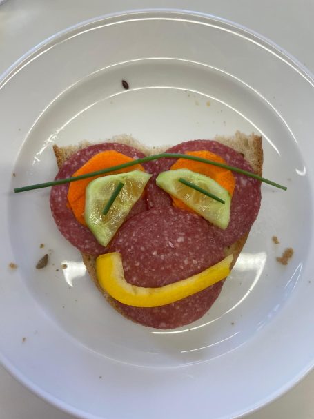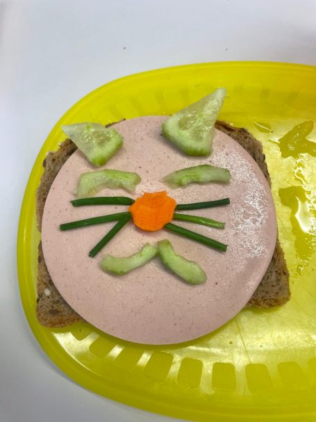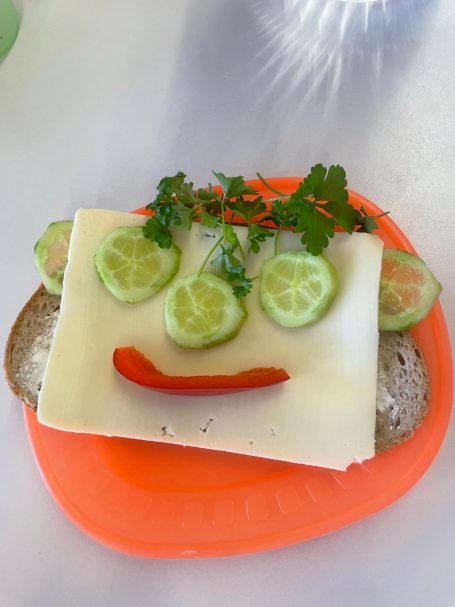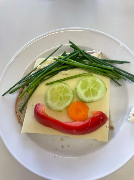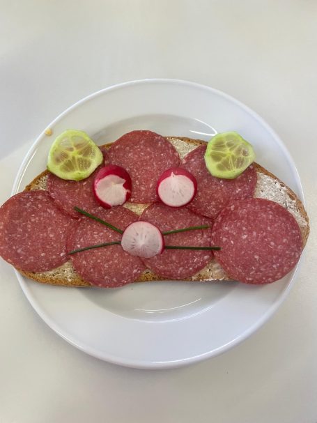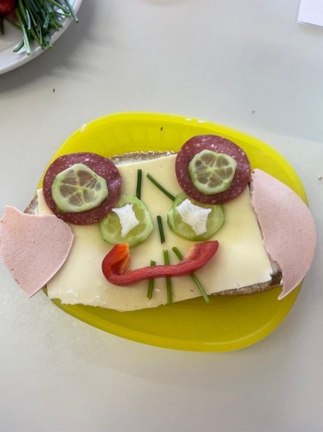 In unserer "Koch- & Back-AG" haben die Kinder beim Projekt „Brotgesichter“ zusammen mit der pädagogischen Mitarbeiterin Jana Böse kreativ leckere Snacks gestaltet. Mit viel Fantasie wurden aus frischem Brot, Gemüse und Aufstrichen bunte Gesichter gezaubert – eine spielerische Art, gesunde Ernährung zu entdecken.