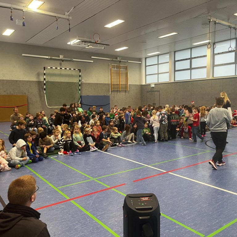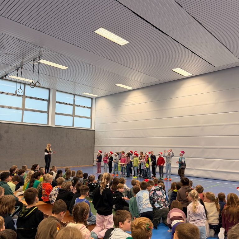 Dafür kamen alle Kinder und Lehrkräfte gemeinsam in der Sporthalle zusammen. Jede Klasse hatte einen eigenen Beitrag vorbereitet – es wurde gesungen 🎶, gerappt, Gedichte wurden vorgetragen 📖 und auch sportliche Darbietungen waren dabei 🤸♂️. Die abwechslungsreichen Auftritte sorgten für eine richtig schöne Stimmung und machten die Weihnachtsfeier zu einem gelungenen gemeinsamen Erlebnis.